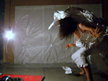 菩須彦スタイルは、暗闇の中、ヘッドライトの明かりだけで3畳サイズ以上のキャンバスに龍を中心とした神獣霊獣や悪魔をわずか30分で描く即興墨絵ライブペインティング。